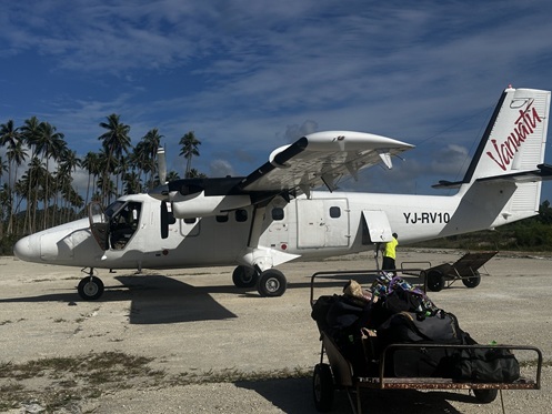 Wir flogen mit Twin Otter Flugzeugen der Air-Vanuatu und mit Fiji-Airways. Die DHC-6 Twin Otter ist ein Flugzeug für 19 Passagiere. Die Turboprop-Maschine ist als Schulterdecker ausgelegt und verfügt über ein feststehendes Fahrwerk. Sie kann auch mit Schwimmern ausgerüstet werden. Die Verstellpropeller ermöglichen die Nutzung von Schubumkehr. Das Flugzeug ist für sehr kurze Start- und Landebahnen optimiert und benötigt nur eine Pistenlänge von 370 m. Es verfügt nicht über eine Druckkabine.