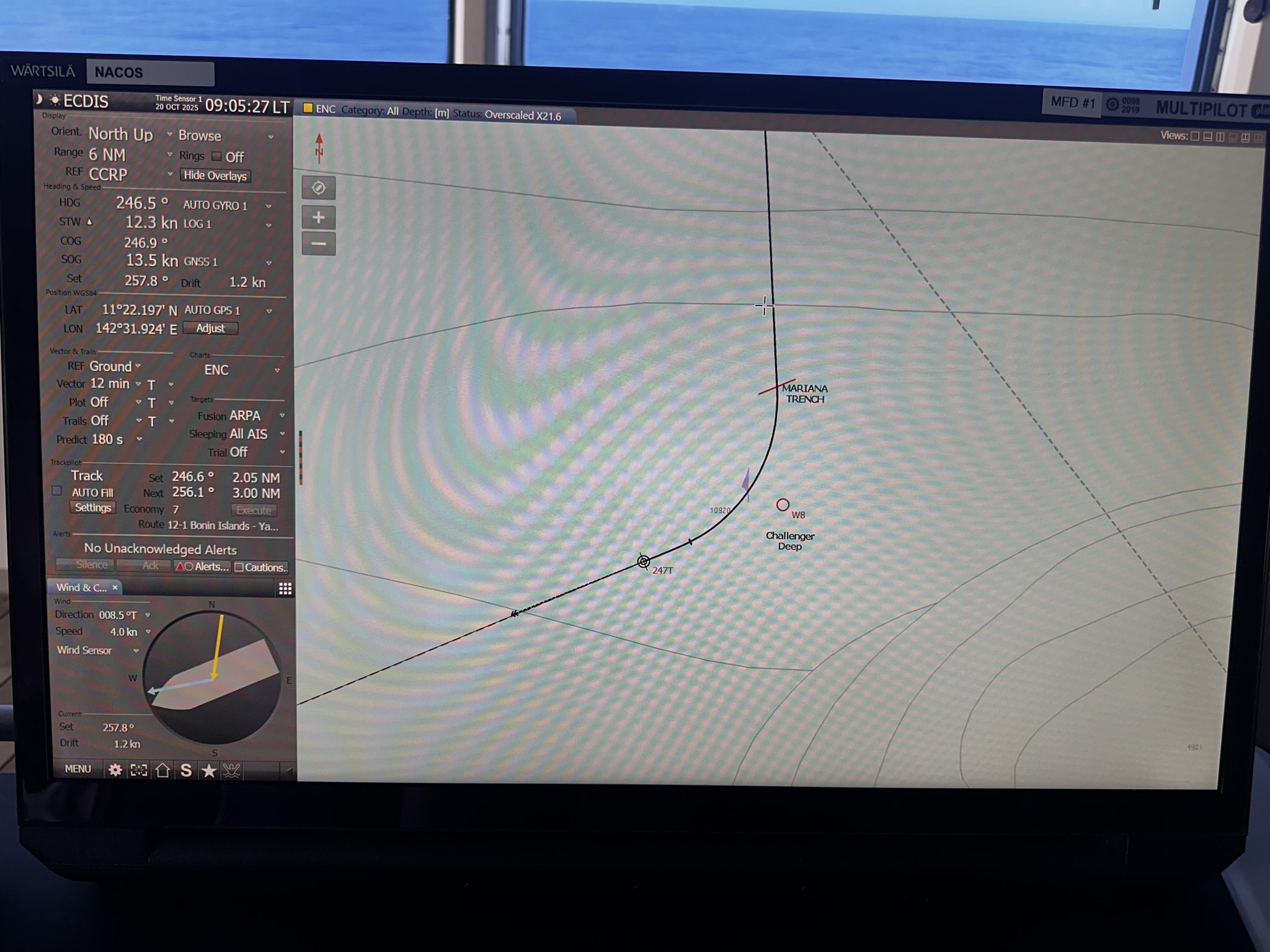 Mit der HANSEATIC spirit fuhren wir im Oktober 2025 über das rund 300 Kilometer südwestlich von Guam liegende Challenger Deep. Diesen „Besuch“ konnten wir auf der Kommandobrücke des Schiffs erleben und uns dessen mit einem Blick auf die Seekarte vergewissern.